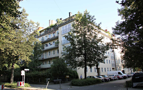 1952 plante Georg Brenninger das Wohngebäude Adalbertstraße / Ecke Isabellastraße in München Schwabing. Ein Gebäude, das den Konventionen eines gehobenen Wohnstandards entspricht. An der Südseite geben Fenstertüren französischer Art den Blick auf eine grüne Oase der Stadt frei.